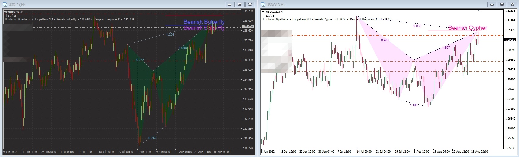 ドル円4時間足とドルカナダ4時間足で売りのハーモニックパターンが出ていたので
