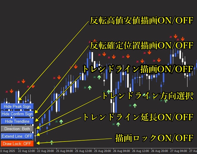 チャート左下のパネルから、順張りで使いたい上昇ラインのみの表示や、逆張りの起点となるラインの延長ON/OFFなど、全ての操作が直感的に行えます。