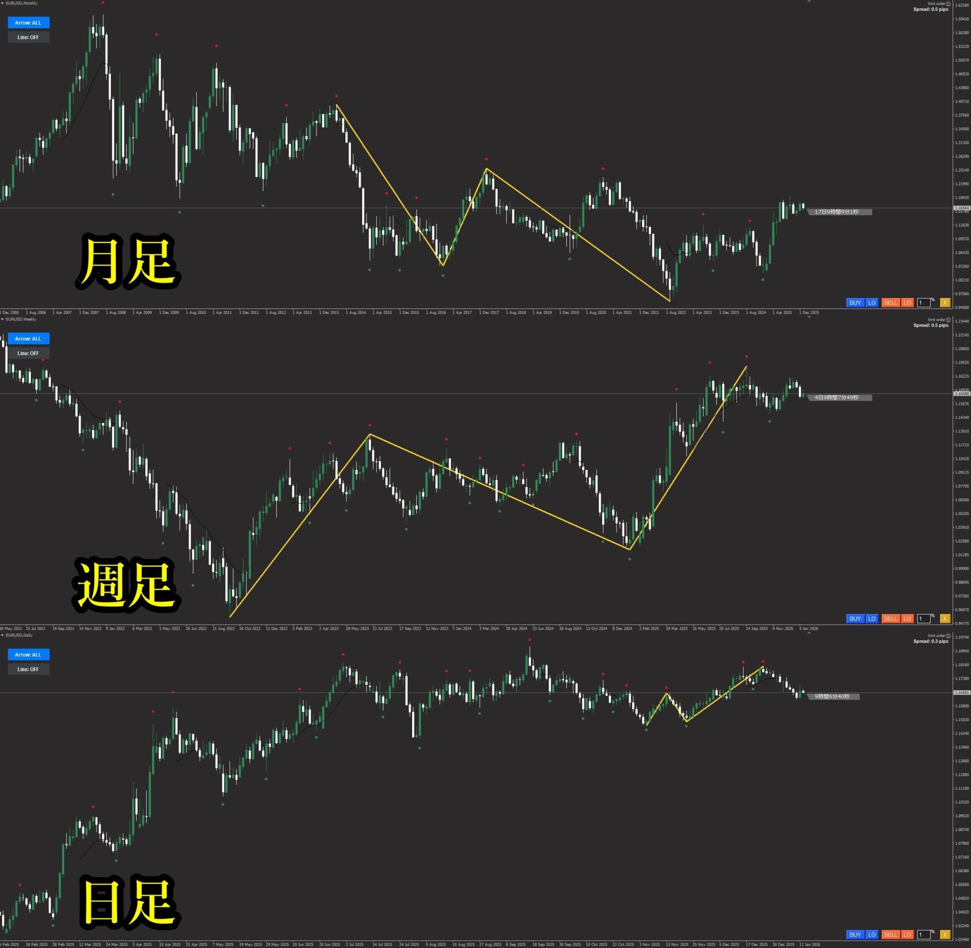 人によってスイングの大きさの感覚は違いますし、ある程度のスパンで波を見るようにしなければ忙しいトレードになってしまいます・・・