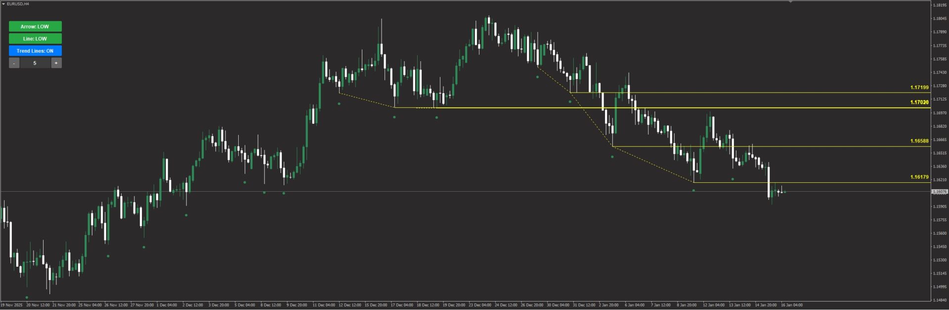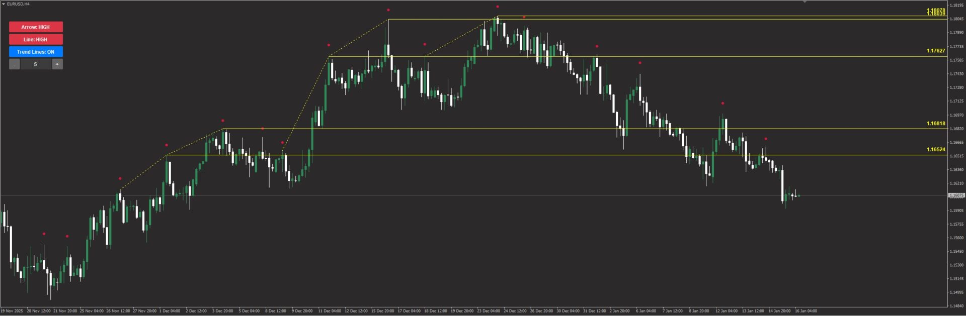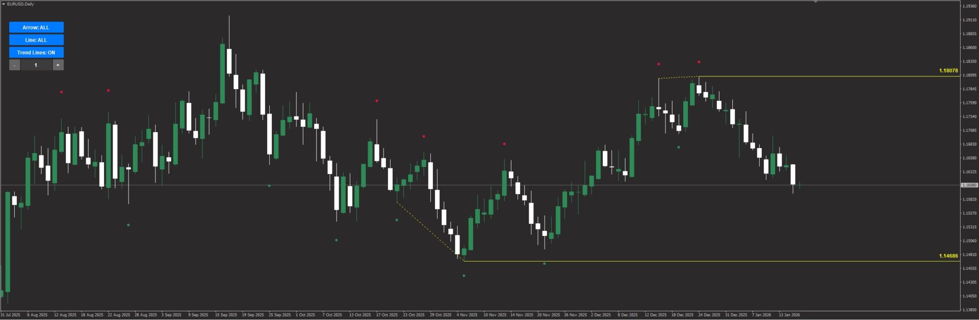 高値同士、安値同士を結ぶ黄色い点線も自動表示。