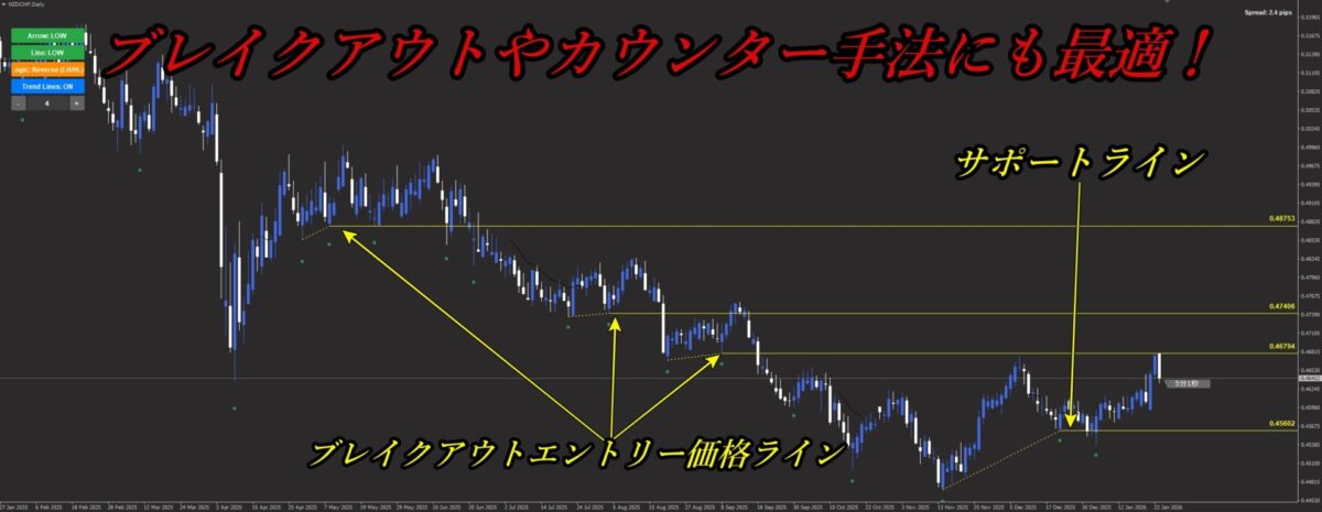 サポートラインとかエントリー価格ラインがバッチリ表示されてるでしょ?